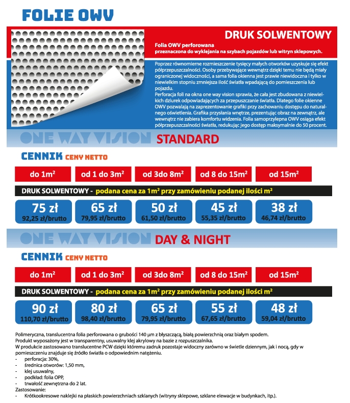 eśli w pomieszczeniu jest widno a na zewnątrz ciemno przy standardowej folii OWV nasza reklama na oknach nie była widoczna – zmieni się to po użyciu folii OWV Night&Day. Specjalnie skonstruowana folia aby Twoja reklama była widoczna niezależnie od oświetlenia Twojego lokalu. Folia przepuszcza światło tak jak i standardowa ale dzięki zastosowaniu translucentnego PCV i perforacji na poziomie 30% przy oświetlonym pomieszczeniu reklama będzie nadal widoczna (przy zmroku na zewnątrz a podświetleniu w środku nadal folia będzie prześwitywała lecz reklama będzie widoczna a nie jak w przypadku standardowej folii OWV).