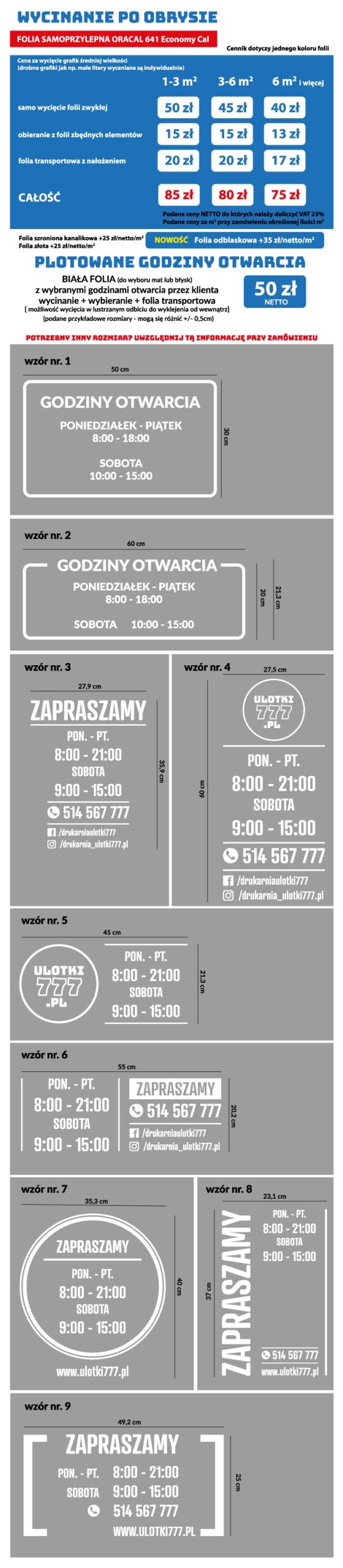 W naszej ofercie znajdą Państwo wiele wzorów gotowych szablonów naklejek z godzinami otwarcia do Państwa