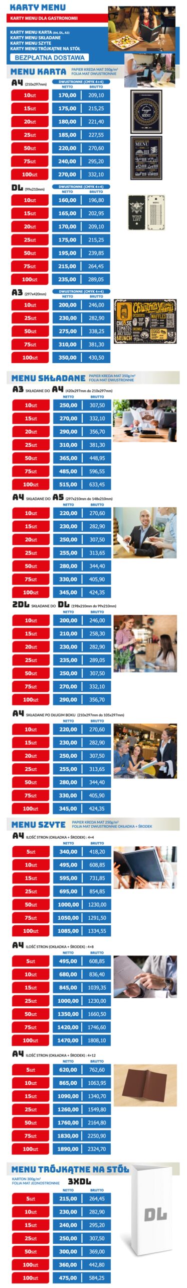 Karty MENU składane pokryte folią