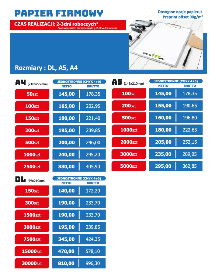Nasza drukarnia oferuje druk papierów firmowych w trzech rozmiarach A4, A5 i DL.