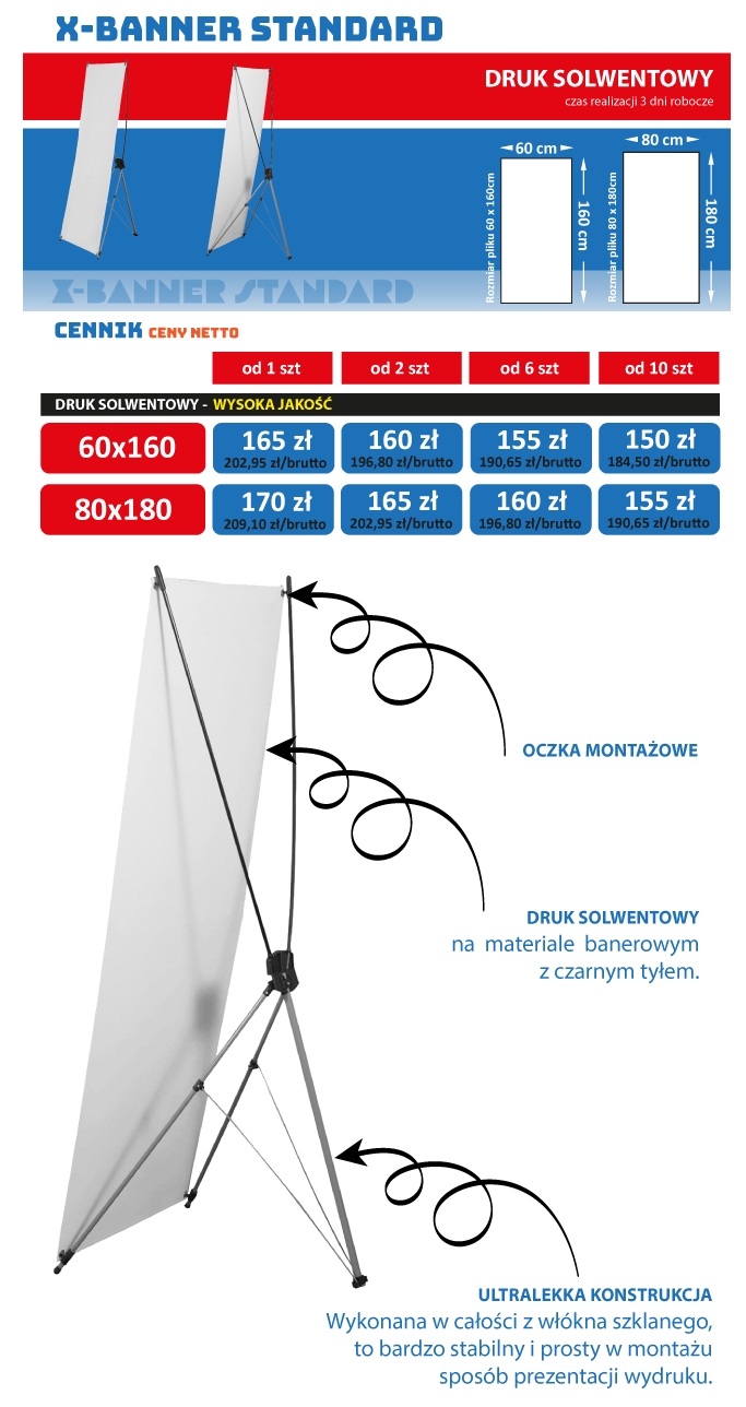(zestaw zawiera konstrukcję i baner reklamowy blockout z kolorowym nadrukiem na jednej stronie.)