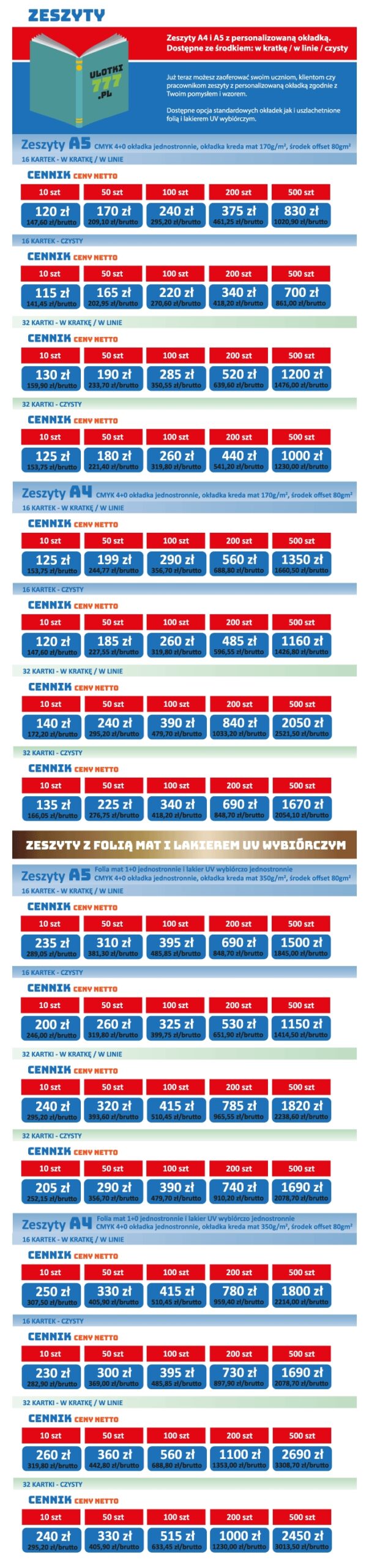 W ofercie zeszytów z nadrukiem w naszej drukarnii mamy rozmiary A4 i A5. Dostępne zeszyty 16 i 32 kartkowe zarówno w opcji standardowej z okładką 170g/m2 jak i 350g/m2 pokrytej dodatkowo folią matową i lakierem UV wybiórczym. Oferowane strony środka: kratka / linia / gładki.